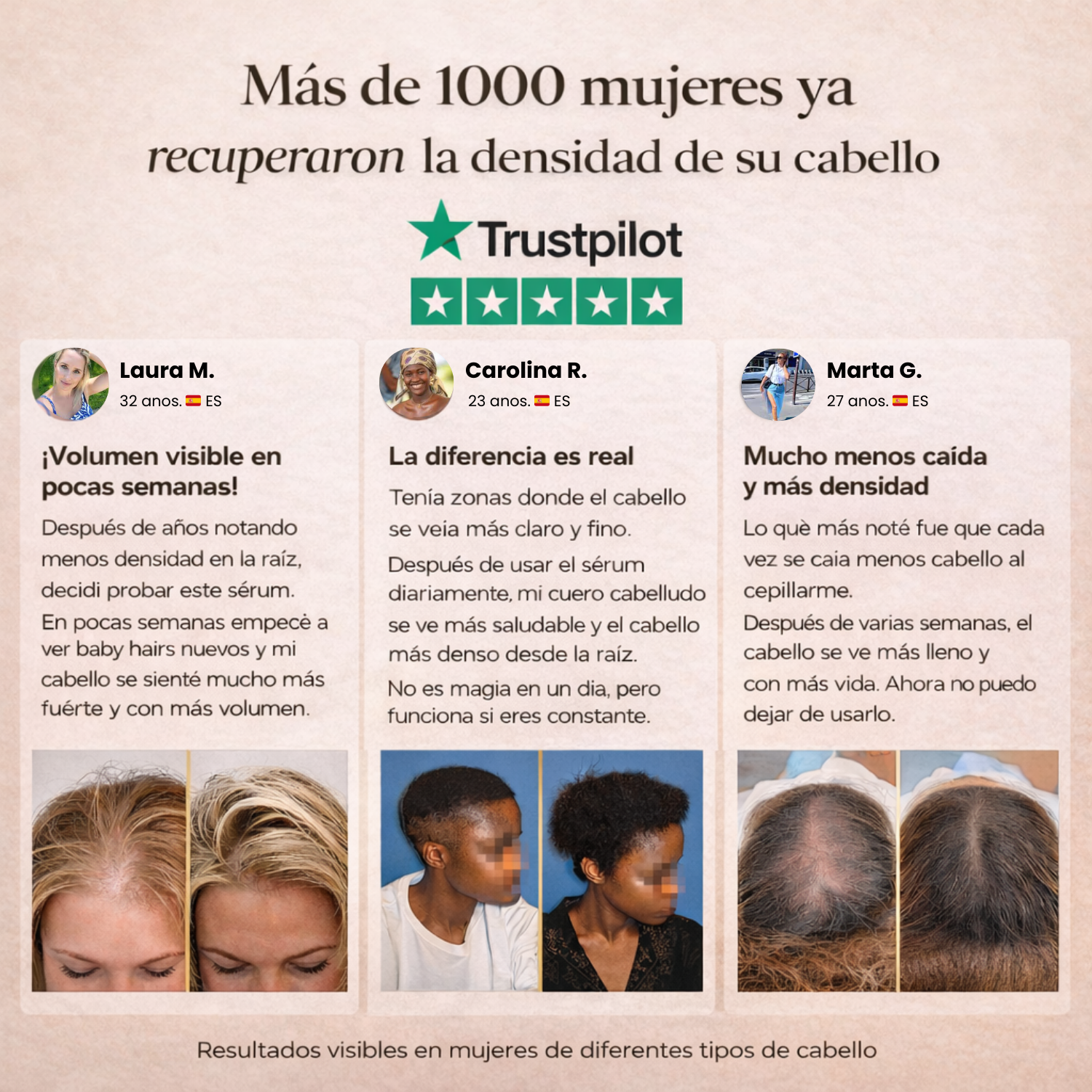Nuestra fórmula natural ha sido diseñada para estimular el folículo desde la raíz, fortalecer el cuero cabelludo y ayudar a recuperar densidad y volumen de forma progresiva y visible.